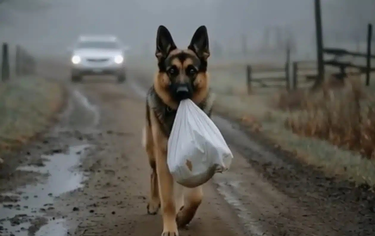 Μια γυναίκα παρατήρησε έναν Γερμανικό Ποιμενικό να περπατάει στον δρόμο κρατώντας μια λευκή σακούλα στο στόμα του· ξαφνικά ένα αυτοκίνητο σταμάτησε δίπλα και ο οδηγός πήρε τη σακούλα από τον σκύλο και έπειτα έφυγε.