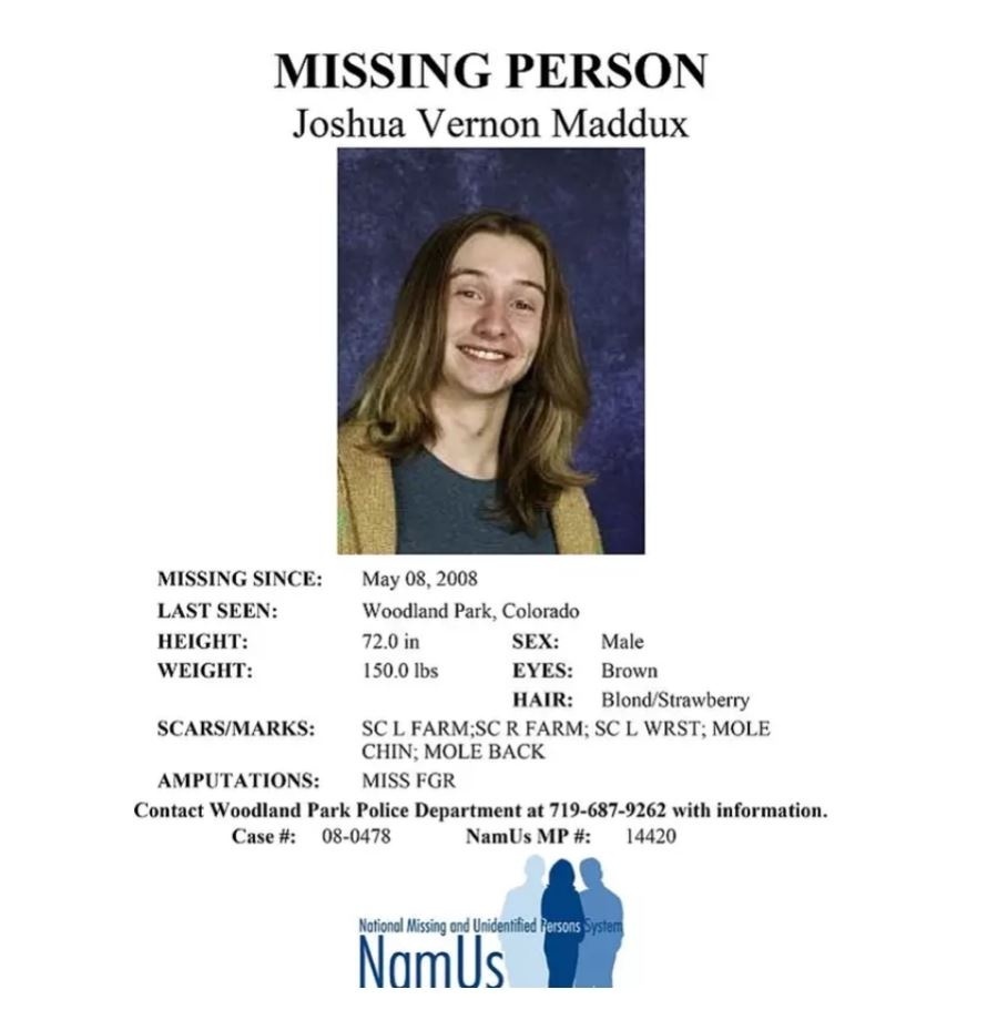 Ο Τζόσουα είχε φύγει τον Μάιο του 2008 από το οικογενειακό του σπίτι στο Γούντλαντ Παρκ της κομητείας Τέλερ στο Κολοράντο, λέγοντας ότι θα πήγαινε για έναν σύντομο περίπατο. Όταν δεν επέστρεψε, οι γονείς του δήλωσαν την εξαφάνισή του. Για χρόνια η οικογένεια κρατούσε ζωντανή την ελπίδα πως ίσως είχε αποφασίσει να εγκαταλείψει την πόλη και να ξεκινήσει από την αρχή, όπως ανέφερε αργότερα η αδελφή του, Κέιτ, στην ιστοσελίδα News of Woodland Park.