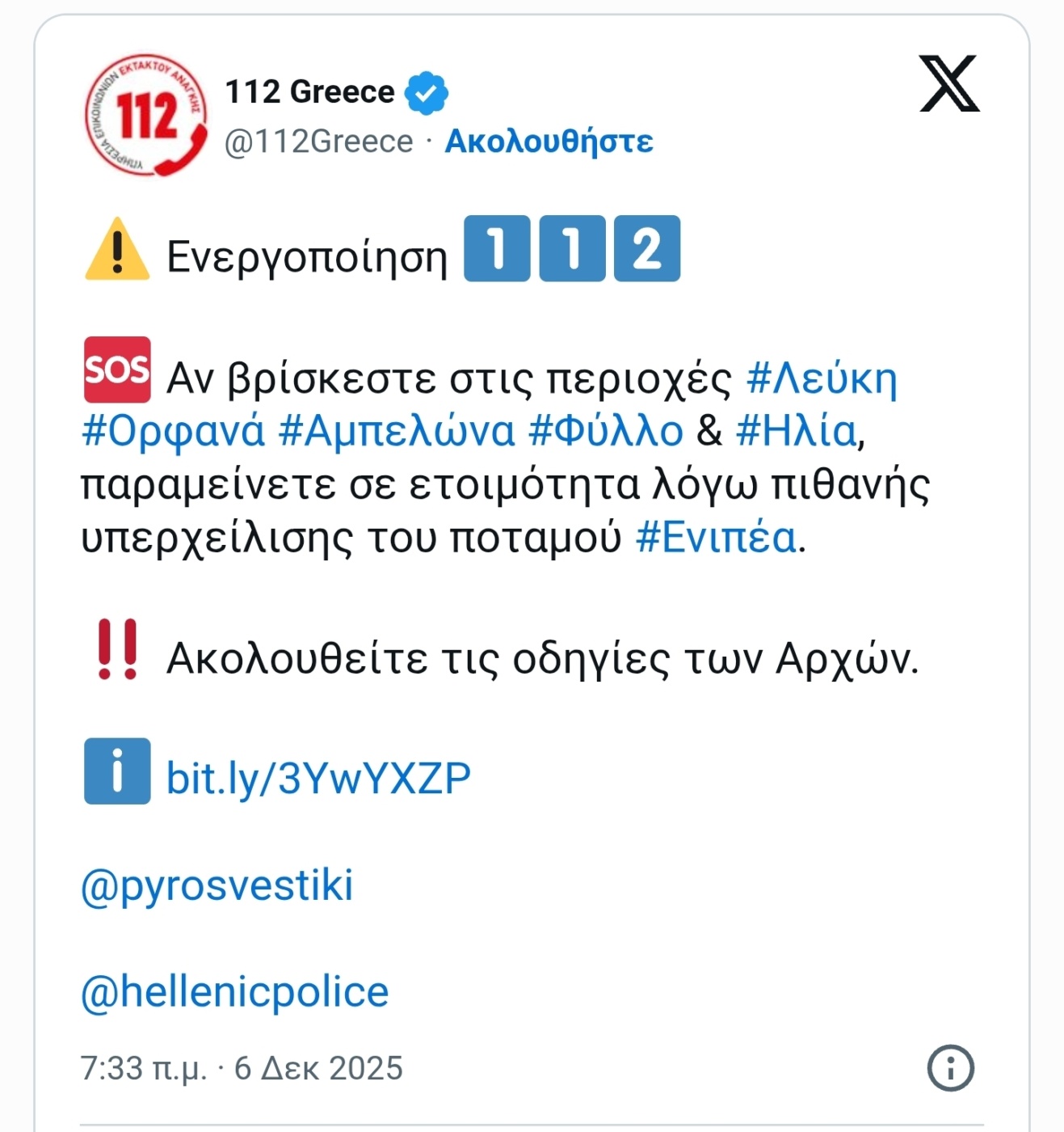 «Αν βρίσκεστε στον οικισμό της Υπέρειας της Περιφερειακής Ενότητας Λάρισας, απομακρυνθείτε προς την πόλη των Φαρσάλων λόγω υπερχείλισης του ποταμού Ενιπέα. Ακολουθείτε τις οδηγίες των Αρχών», αναφέρεται στο μήνυμα.