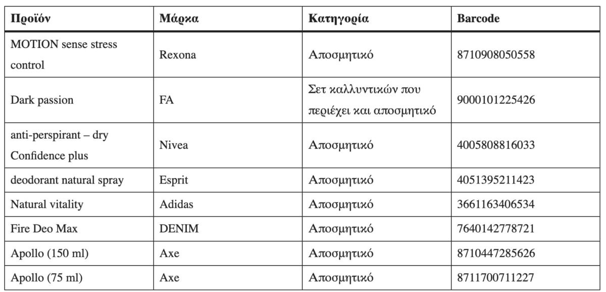 Ακολουθεί πίνακας με τα αποσμητικά που ανακλήθηκαν, σύμφωνα με τα στοιχεία ειδοποίησης της Ευρωπαϊκής Ένωσης: