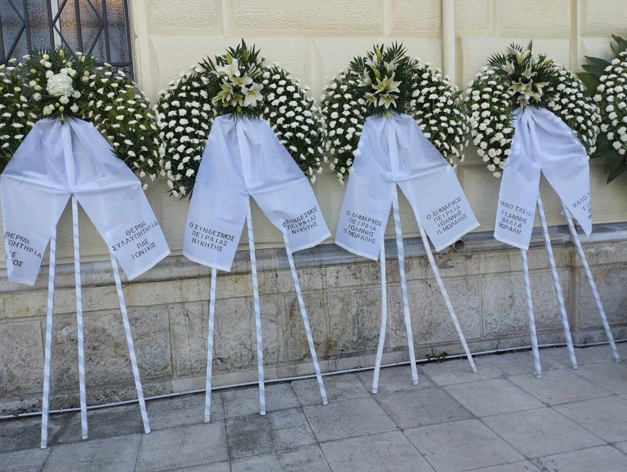 Ο Ιερός Ναός του Αγίου Νικολάου έχει πλημμυρίσει από στεφάνια από τον επιχειρηματικό και πολιτικό κόσμο της χώρας. Μεταξύ άλλων στεφάνια έχουν στείλει η ΠΑΕ ΠΑΟΚ, το Όραμα Ελπίδας, ο Ευάγγελος Μυτιληναίος, ο Βασίλης Κικίλιας, η Μάνια Λούβαρη, ο Γιώργος Λούβαρης, η Μαρία Μπεκατώρου, ο Θάνος Πλεύρης, η Capital ship man, η Alter ego media, ο Γιάννης και η Δέσποινα Βρέντζου, οι παίκτες του Ολυμπιακού, η Nottingham forest FC, ο Thrylos 24, ο Πρόεδρος της ΕΠΟ, Μάκης Γκαγκάτσης, ο Νίκος Αναστασιαδης τέως Πρόεδρος της Κυπριακής Δημοκρατίας, Νίκος Χριστοδουλίδης