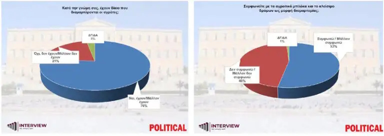 Στην ερώτηση αν κατά τη γνώμη τους έχουν δίκιο οι αγρότες που διαμαρτύρονται, το 76% απαντά ότι έχουν/μάλλον έχουν δίκιο, το 21% ότι έχουν/ μάλλον έχουν άδικο, ενώ 3% απαντά ΔΞ/ΔΑ.