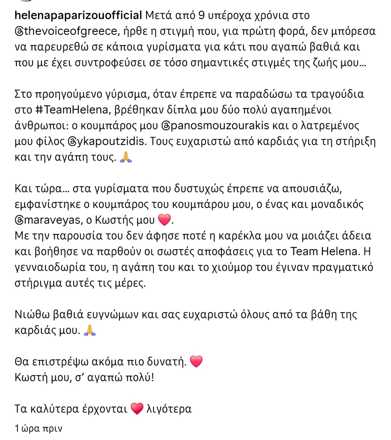 Στη συνέχεια, η Έλενα Παπαρίζου ανέφερε: «Στο προηγούμενο γύρισμα, όταν έπρεπε να παραδώσω τα τραγούδια στο #TeamHelena, βρέθηκαν δίπλα μου δύο πολύ αγαπημένοι άνθρωποι: ο κουμπάρος μου Πάνος Μουζουράκης και ο λατρεμένος μου φίλος Γιώργος Καπουτζίδης. Τους ευχαριστώ από καρδιάς για τη στήριξη και την αγάπη τους»