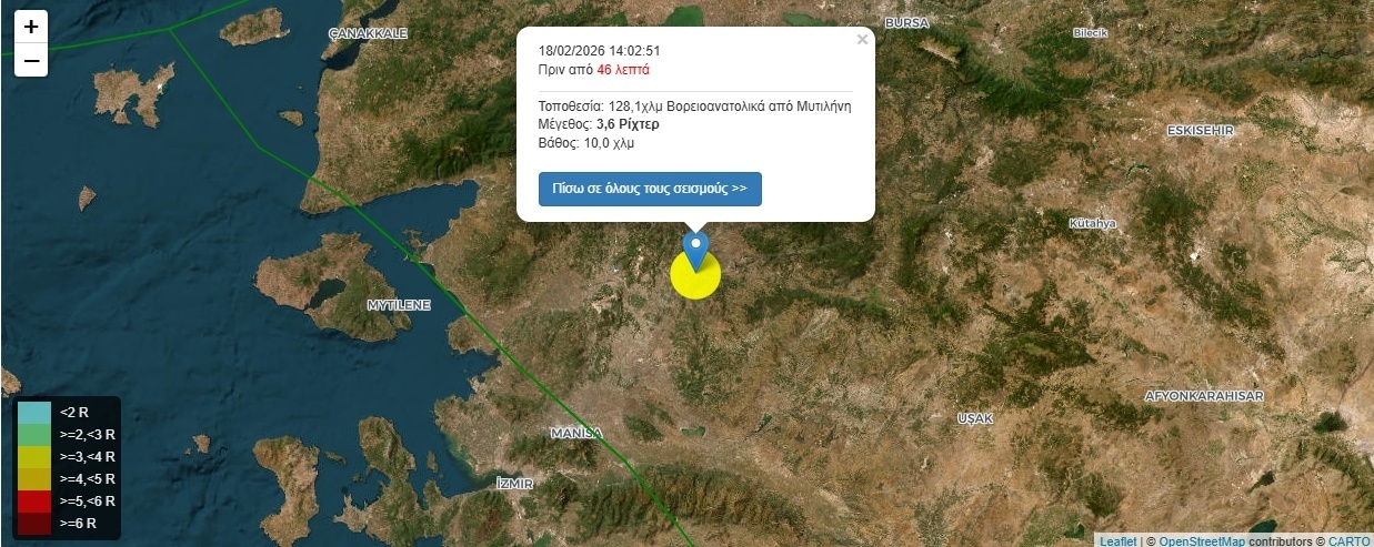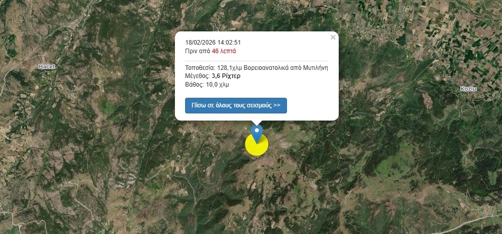 Σεισμός 3,6 Ρίχτερ 128,1χλμ Βορειοανατολικά από Μυτιλήνη στις 18/02/2026 14:02:51