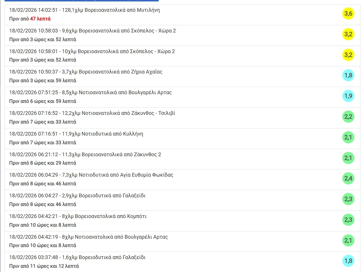 Πιο κάτω θα βρεις σε λίστα τους πιο πρόσφατους σεισμούς στην Ελλάδα.