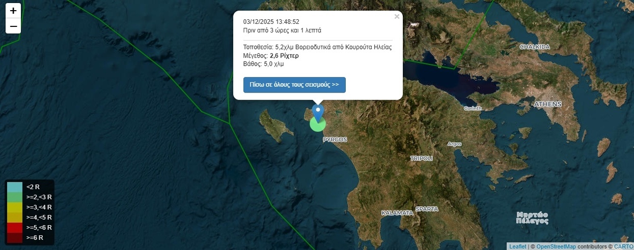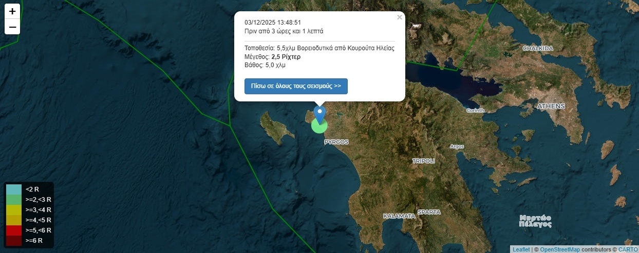 Σεισμός 2,5 Ρίχτερ 5,5χλμ Βορειοδυτικά από Κουρούτα Ηλείας στις 03/12/2025