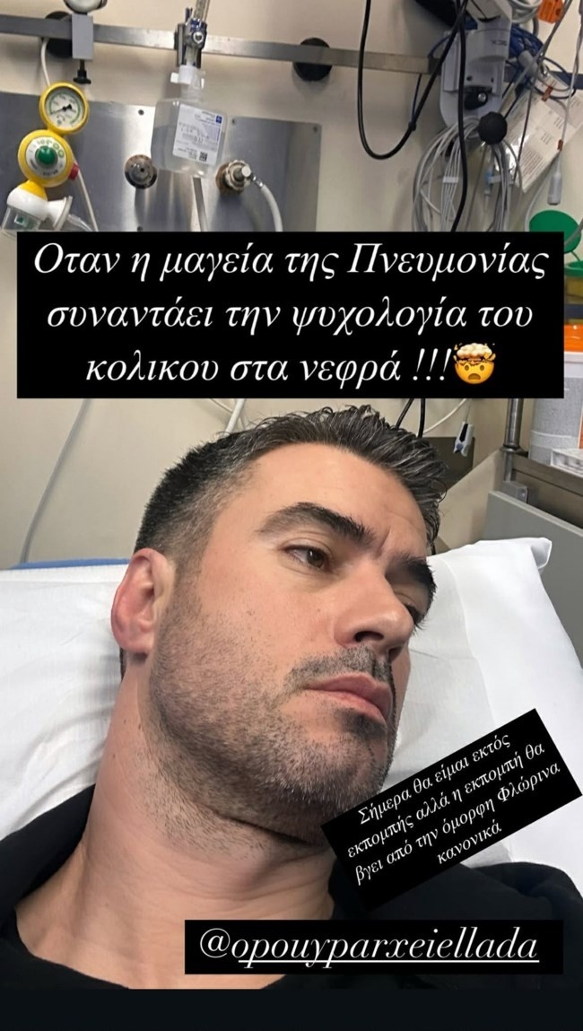 Μάλιστα ανάρτησε μία φωτογραφία μέσα από νοσοκομείο γράφοντας: “Όταν η μαγεία της πνευμονίας συναντά την ψυχολογία του κολικού στα νεφρά. Σήμερα θα είμαι εκτός εκπομπής, αλλά η εκπομπή θα βγει από την όμορφη Φλώρινα κανονικά”.