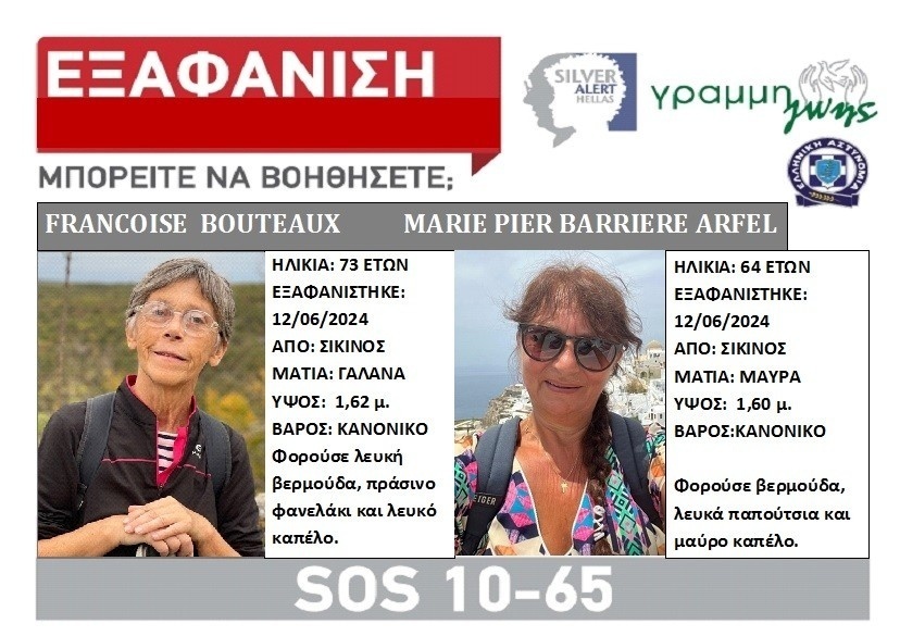 Η Φρανσουάζ Μπουτό 73 χρόνων και η Μαρί Πιέρ Αρφέλ, 64 χρονών αγνοούνται από το πρωί της Παρασκευής 14 Ιουνίου. Οι δύο γυναίκες που φαίνεται ότι γνωρίστηκαν μετά την άφιξη τους στο νησί, έδωσαν ραντεβού έξω από το κατάλυμα που διέμενε η Μαρί, για να ακολουθήσουν μαζί μια από τις πεζοπορικές διαδρομές του νησιού. Φαίνεται όμως πως για άγνωστο λόγο βρέθηκαν εκτός πορείας και τα ίχνη τους χάθηκαν.