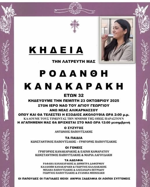 Βαθιά θλίψη έχει σκορπίσει στην τοπική κοινωνία του Ηρακλείου η είδηση του πρόωρου θανάτου της Ροδάνθης Κανακαράκη, η οποία έφυγε από τη ζωή σε ηλικία μόλις 32 ετών.