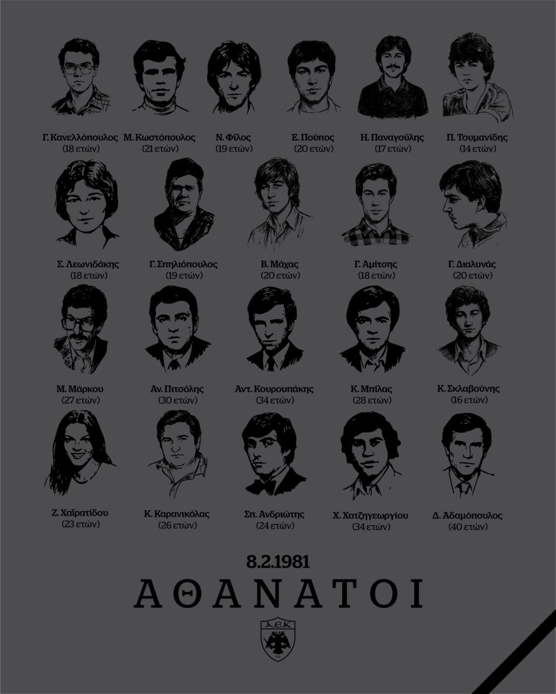 “Η Οικογένεια της ΑΕΚ τιμά και σήμερα τη μνήμη των 20 νέων ανθρώπων, φιλάθλων του Ολυμπιακού και ενός της ΑΕΚ, που έχασαν άδικα τη ζωή τους στις 8 Φεβρουαρίου του 1981, ευρισκόμενοι ως θεατές απλά στο γήπεδο δίπλα στις αγαπημένες τους ομάδες
