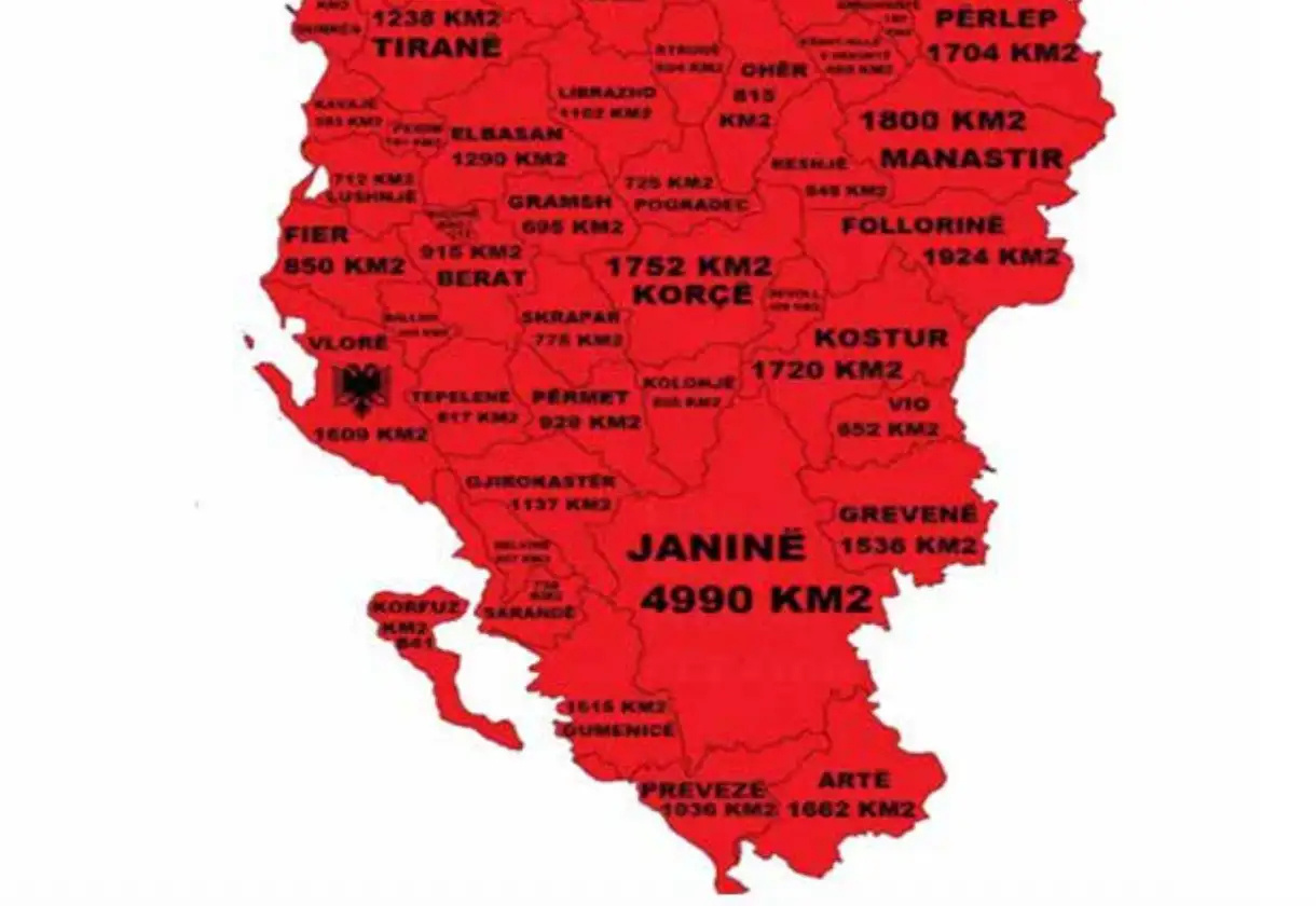 Μάλιστα ο χάρτης παρουσιάζει ελληνικά εδάφη ως «ιστορικές αλβανικές περιοχές», με αναγραφή ονομάτων και εκτάσεων σε τετραγωνικά χιλιόμετρα.