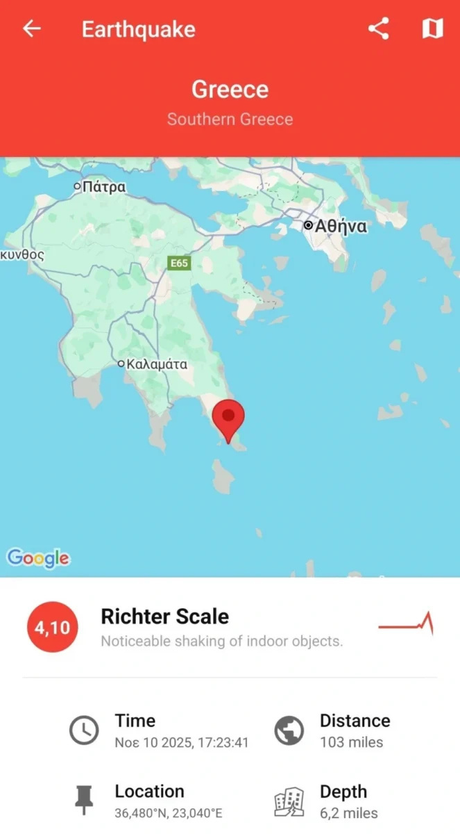 Το εστιακό βάθος υπολογίζεται στα10 χιλιόμετρα, ενώ ο σεισμός έγινε αισθητός σε αρκετές περιοχές της νότιας Ελλάδας, προκαλώντας ελαφρά δόνηση σε εσωτερικούς χώρους.