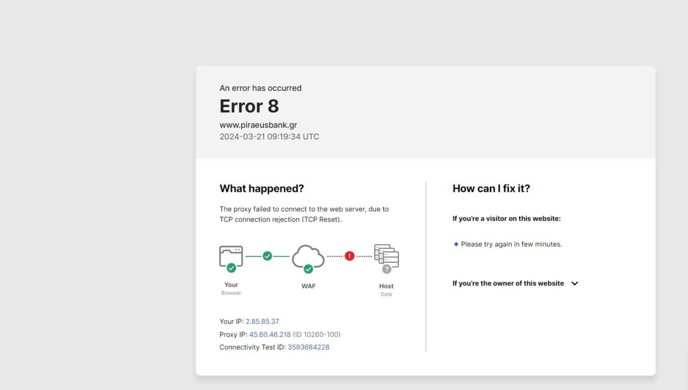 Το πρόβλημα ξεκίνησε νωρίς το απόγευμα, με το e-banking της τράπεζας να τίθεται εντελώς εκτός λειτουργίας. Πολλοί χρήστες ανέφεραν ότι δεν μπορούσαν να συνδεθούν, λαμβάνοντας το μήνυμα “Error 8”.