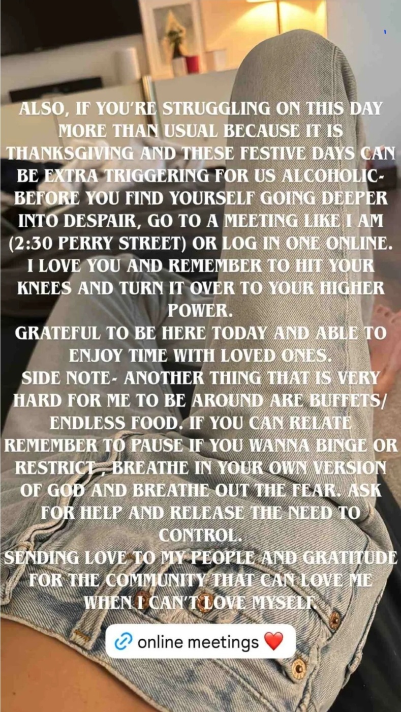 Η ίδια μοιράστηκε με τους διαδικτυακούς της φίλους τη δική της προτροπή: «Αν δυσκολεύεσαι αυτήν την ημέρα περισσότερο από το συνηθισμένο επειδή είναι Ημέρα των Ευχαριστιών και αυτές οι γιορτινές μέρες μπορεί να είναι ιδιαίτερα δύσκολες για εμάς τους αλκοολικούς, πριν βρεθείς να βυθίζεσαι ακόμη πιο βαθιά στην απόγνωση, πήγαινε σε μια συνάντηση όπως πηγαίνω κι εγώ ή μπες σε μία διαδικτυακά».