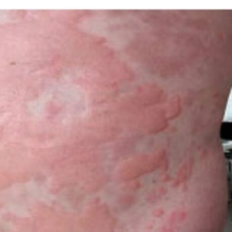 Προκαλεί έντονα κνησμώδεις, υπερυψωμένες πλάκες στο δέρμα, γνωστές ως πομφοί (ή “hives”), που μπορεί να είναι στρογγυλοί ή δακτυλιοειδείς και συχνά ενώνονται μεταξύ τους.