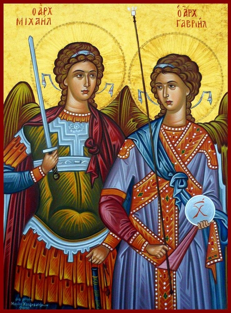 Η Εκκλησία στις 8 Νοεμβρίου γιορτάζει τη σύναξη των Παμμέγιστων αρχαγγέλων Μιχαήλ και Γαβριήλ, καθώς και των υπολοίπων Ασωμάτων και Ουράνιων Αγγελικών Ταγμάτων. Ο Αρχάγγελος Μιχαήλ και ο Αρχάγγελος Γαβριήλ παρουσιάζονται συνήθως με σπαθί .