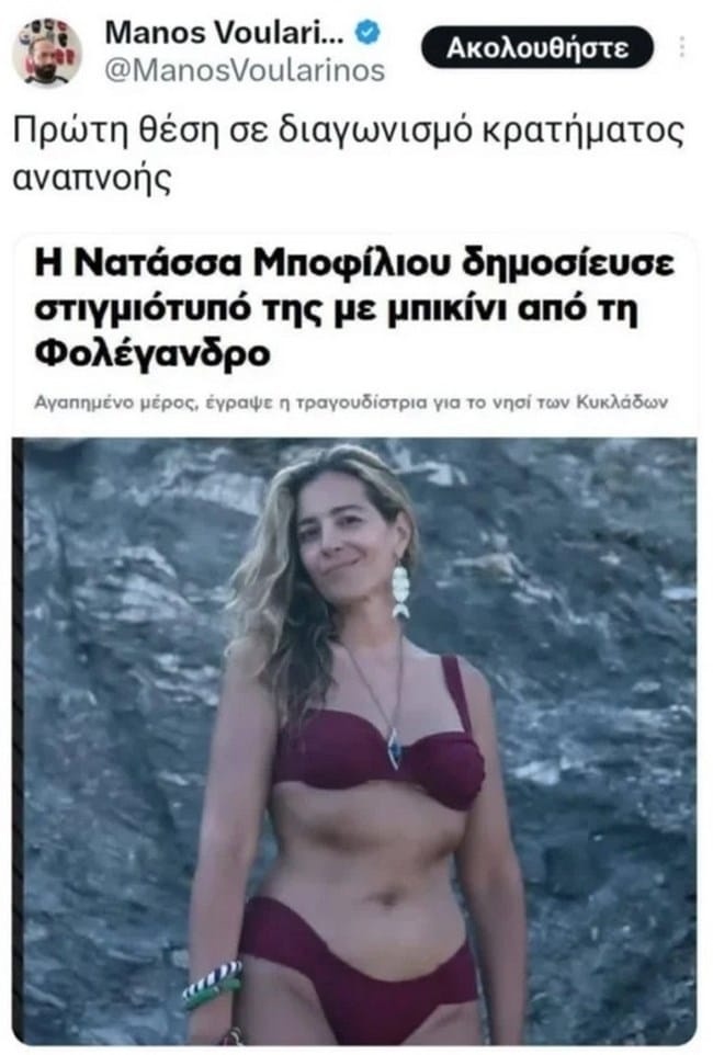 Συγκεκριμένα, ο δημοσιογράφος πόσταρε στον λογαριασμό του στο Twitter ένα άρθρο με τίτλο “Η Νατάσσα Μποφίλιου δημοσίευσε στιγμιότυπό της με μπικίνι από την Φολέγανδρο” και σχολίασε: “Πρώτη θέση σε διαγωνισμό κρατήματος αναπνοής”.