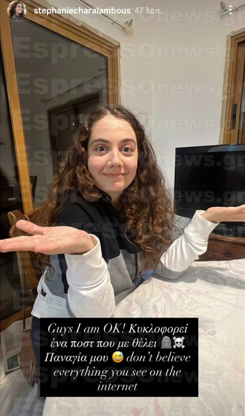 «Παιδιά, είμαι μια χαρά! Κυκλοφορεί ένα ποστ που με θέλει νεκρή Παναγία μου. Μην πιστεύετε τα πάντα που βλέπετε στο ίντερνετ», σημείωσε η ίδια στην ανάρτηση που έκανε στον προσωπικό της λογαριασμό στο Instagram.