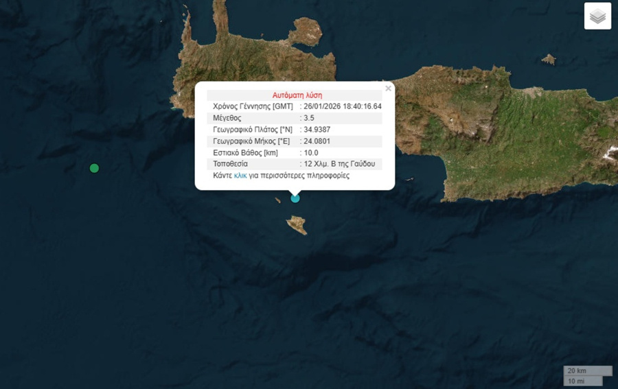 Σεισμική δόνηση καταγράφηκε το βράδυ της Δευτέρας στη θαλάσσια περιοχή νότια της Κρήτης, προκαλώντας στιγμιαία ανησυχία χωρίς ωστόσο να υπάρξουν αναφορές για ζημιές ή προβλήματα. Ο σεισμός σημειώθηκε κοντά στη Γαύδος, σε περιοχή όπου κατά καιρούς καταγράφεται χαμηλής έντασης σεισμική δραστηριότητα.