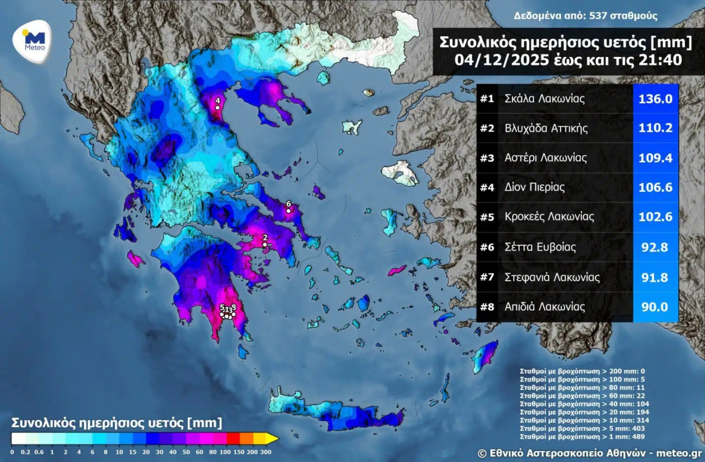 Τα αθροιστικά ύψη βροχόπτωσης όπως αυτά καταγράφηκαν από 101 μετεωρολογικούς σταθμούς του δικτύου αυτόματων μετεωρολογικών σταθμών του Εθνικού Αστεροσκοπείου Αθηνών / meteo.gr, φανερώνουν το μέγεθος του φαινομένου.