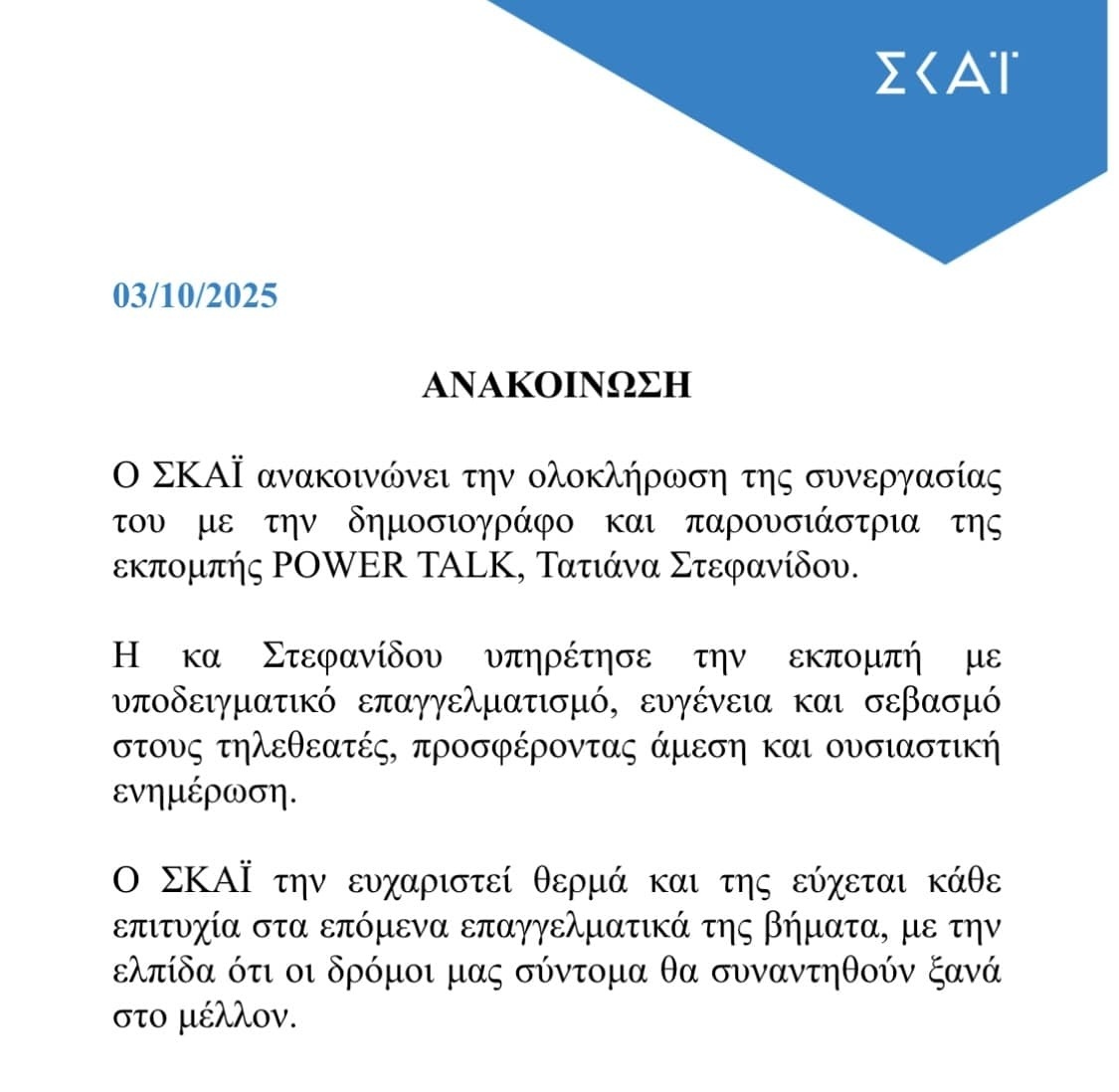 Ο ΣΚΑΪ ανακοινώνει την ολοκλήρωση της συνεργασίας του με τη δημοσιογράφο και παρουσιάστρια της εκπομπής “Power Talk”, Τατιάνα Στεφανίδου.