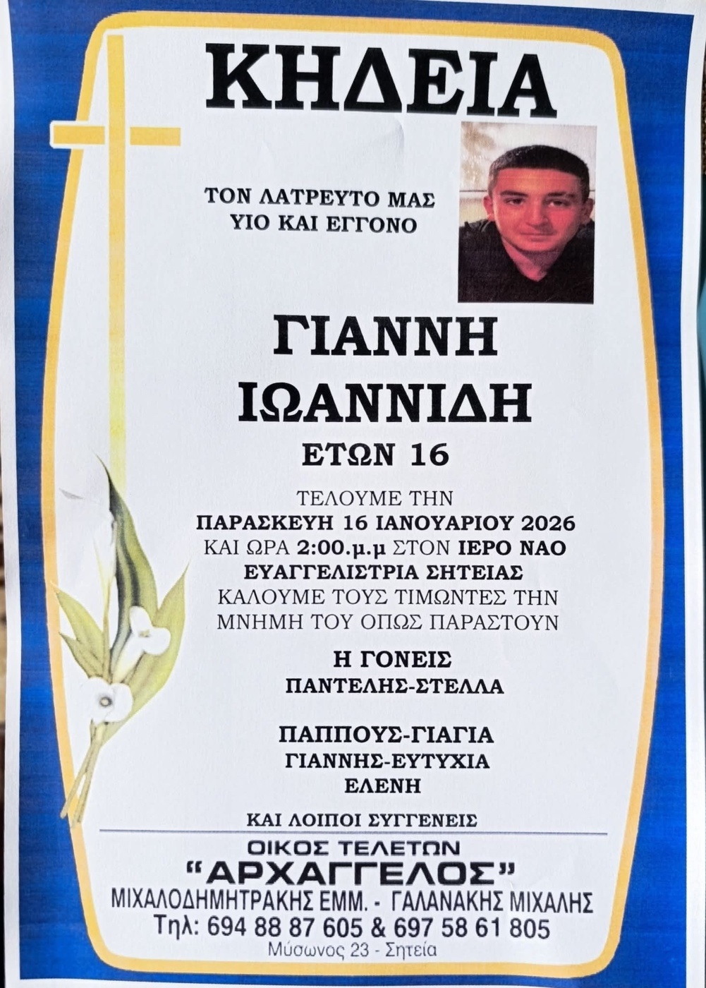Βαρύ πένθος στη Σητεία: Αύριο το τελευταίο «αντίο» στον 16χρονο Γιάννη – Συγκλονισμένοι συγγενείς και φίλοι