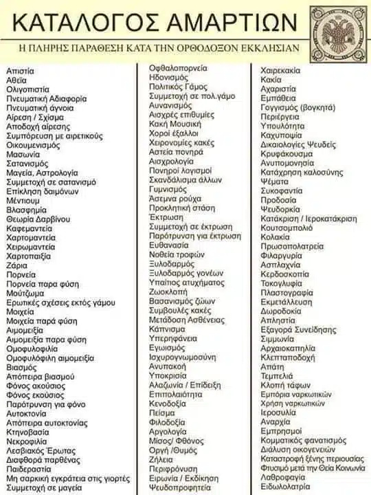 Αν λοιπόν έχετε διαπράξει οποιαδήποτε από τα αμαρτήματα που ακολουθούν το μόνο που χρειάζεται είναι να τρέξετε στον πνευματικό σας, να το εξομολογηθείτε και να δηλώσετε ότι μετανιώνετε για αυτό. Οι πύλες της βασιλείας των ουρανών θα είναι τότε όλες δικές σας. Μάθετε όμως πρώτα ποια είναι τα αμαρτήματα για να μην λέτε μετά ότι δεν ξέρατε.