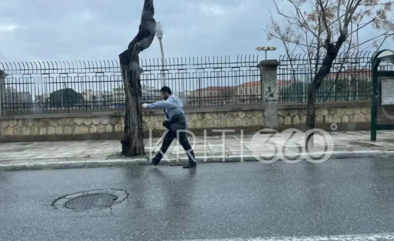 Περαστικοί τον είδαν με σταθερό βήμα και αποφασιστικότητα να περπατά την οδό Παπανδρέου χωρίς να ενοχλείται από τις ψιχάλες της βροχής.