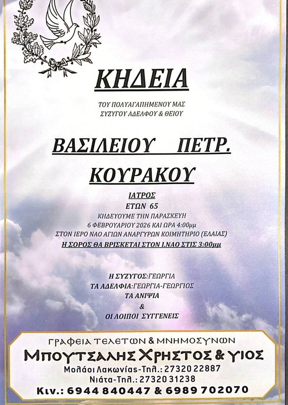 Φτωχότερη έγινε η ιατρική και όχι μόνο κοινότητα της Λακωνίας, καθώς σε ηλικία 65 ετών έφυγε από τη ζωή ο γνωστός Λάκωνας ιατρός–δερματολόγος, Βασίλειος Κουράκος, βυθίζοντας στο πένθος τον Δήμο Ευρώτα και την ευρύτερη περιοχή της Λακωνίας.