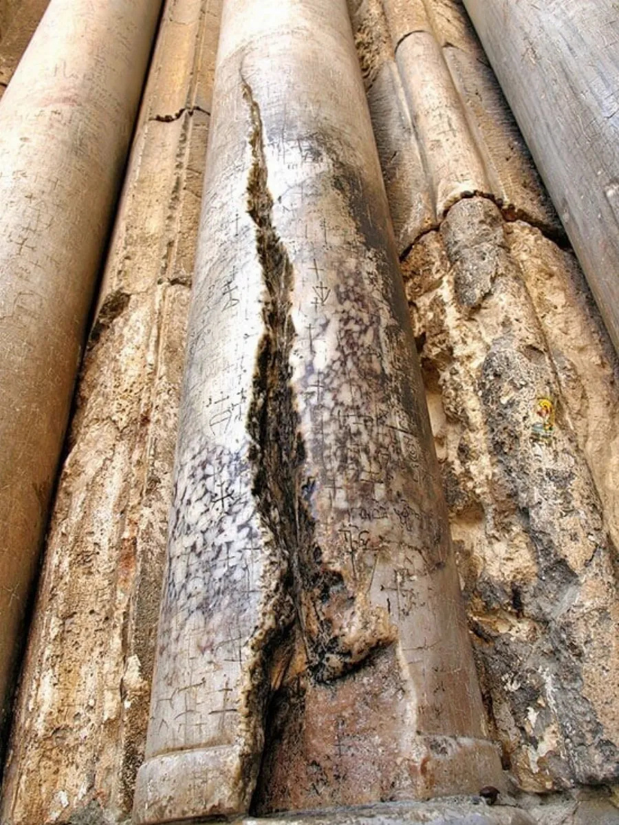 Η ρωγμή που βρίσκεται στον μεσαίο κίονα αριστερά της εισόδου του συγκροτήματος του Παναγίου Τάφου, έχει ύψος 1.20 μ. και όπως βλέπετε τις φωτογραφίες, μοιάζει με ανερχόμενη φλόγα.