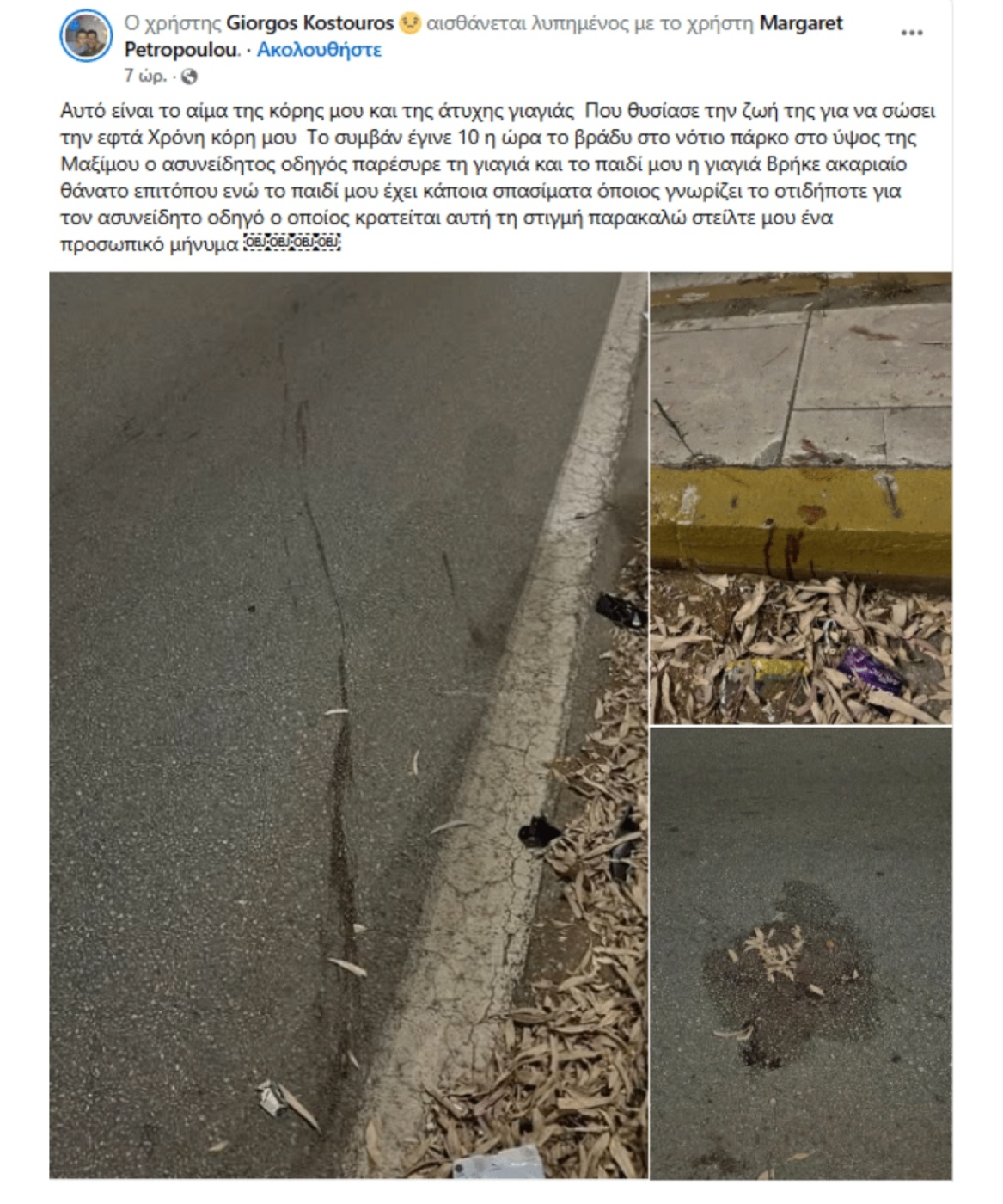Ο πατέρας του κοριτσιού είχε γράψει νωρίτερα, σύμφωνα με το tempo24.news έγραψε: «Αυτό είναι το αίμα της κόρης μου και της άτυχης γιαγιάς που θυσίασε την ζωή της για να σώσει την 7χρονη κόρη μου. Το συμβάν έγινε 10 η ώρα το βράδυ στο νότιο πάρκο στο ύψος της Μαξίμου ο ασυνείδητος οδηγός παρέσυρε τη γιαγιά και το παιδί μου. Η γιαγιά βρήκε ακαριαίο θάνατο επιτόπου ενώ το παιδί μου έχει κάποια σπασίματα όποιος γνωρίζει το οτιδήποτε για τον ασυνείδητο οδηγό, ο οποίος κρατείται αυτή τη στιγμή παρακαλώ στείλτε μου ένα προσωπικό μήνυμα».
