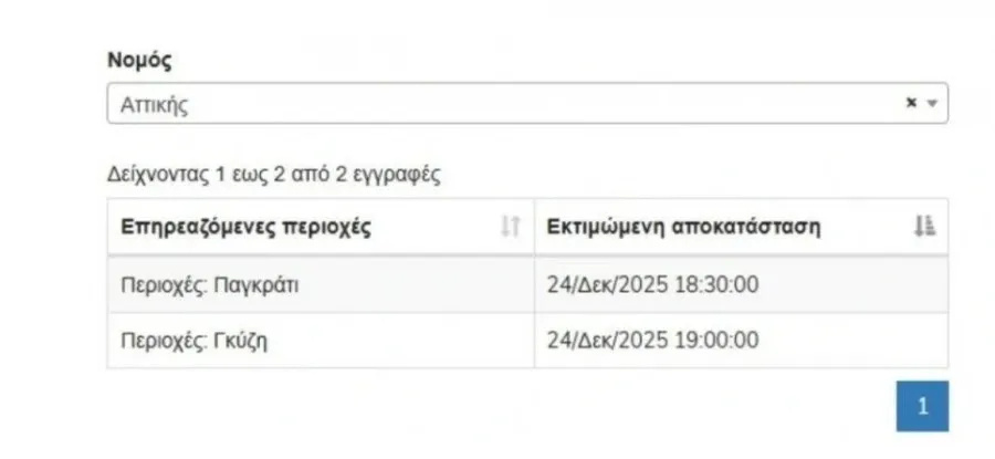 Η ηλεκτροδότηση αναμένεται να αποκατασταθεί σε Παγκράτι και Βύρωνα μετά τις 18.30, ενώ στου Γκύζη στις 19.00, σύμφωνα με ανάρτηση του ΔΕΔΔΗΕ.