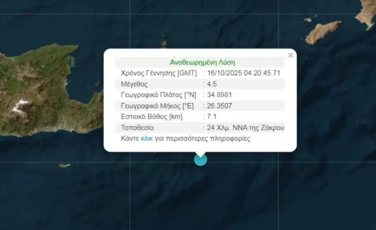Σεισμός τώρα 4,5 Ρίχτερ σημειώθηκε νοτιοανατολικά της Κρήτης.