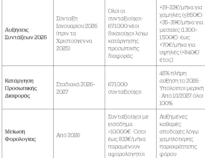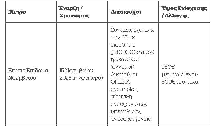 Η κυβέρνηση δρομολογεί σειρά μέτρων στήριξης για περίπου 2 εκατομμύρια συνταξιούχους, με στόχο την ενίσχυση του εισοδήματος απέναντι στην ακρίβεια. Οι παρεμβάσεις ξεκινούν από τον Νοέμβριο 2025 με την καταβολή του επιδόματος των 250 ευρώ, ενώ θα ακολουθήσουν αυξήσεις στις συντάξεις, μείωση φόρων και άλλες παροχές.