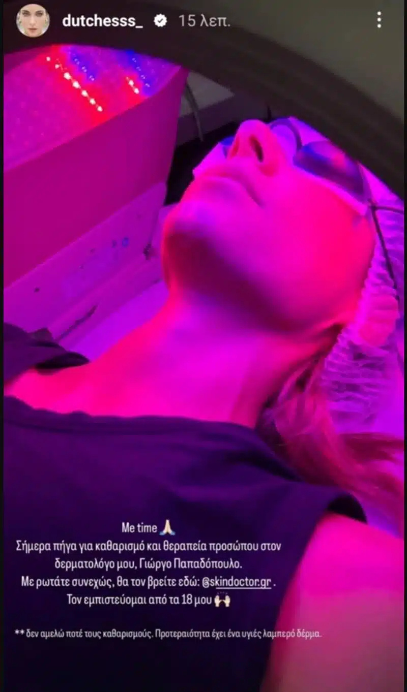 «Σήμερα πήγα για καθαρισμό και θεραπεία προσώπου στον δερματολόγο μου, Γιώργο Παπαδόπουλο. Με ρωτάτε συνεχώς. Τον εμπιστεύομαι από τα 18 μου. Δεν αμελώ ποτέ τους καθαρισμούς. Προτεραιότητα έχει ένα υγιές λαμπερό δέρμα» έγραψε η Δούκισσα ενώ στη φωτογραφία φαίνεται πως κάθεται κάτω από μια λάμπα led κάνοντας φωτοθεραπεία συγκεκριμένα με κόκκινο φως.