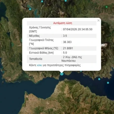 Σεισμική δόνηση μεγέθους 3,5 βαθμών της κλίμακας Ρίχτερ σημειώθηκε λίγα λεπτά μετά τις 23:30, το βράδυ της Μεγάλης Τρίτης, Δυτικά της Ναυπάκτου.