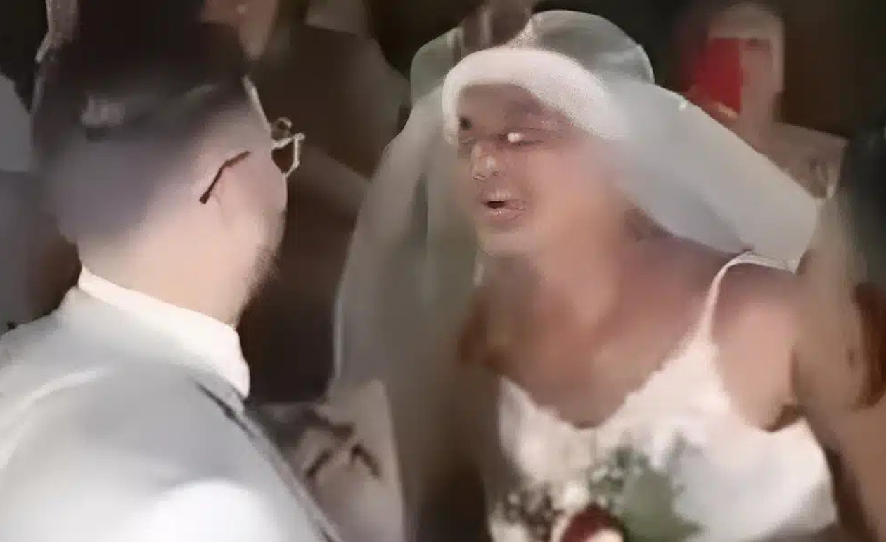 Λίγο πριν ξεκινήσει το μυστήριο, ο άνδρας έκανε την είσοδό του… ντυμένος νύφη! Φορούσε λευκό νυφικό, πέπλο, κρατούσε ανθοδέσμη και περπατούσε με χάρη, μιμούμενος την πραγματική νύφη, η οποία εκείνη την ώρα ετοιμαζόταν να κάνει την παραδοσιακή της είσοδο. Η απρόσμενη αυτή εμφάνιση προκάλεσε ξέσπασμα γέλιου και παρατεταμένα χειροκροτήματα από τους καλεσμένους, οι οποίοι δεν μπορούσαν να πιστέψουν αυτό που έβλεπαν.