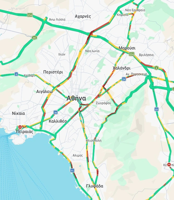 Όπως παρατηρείται και στον παρακάτω χάρτη, με αργές ταχύτητες κινούνται τα οχήματα στην Κηφίσιας, από τους Αμπελόκηπους έως το Χαλάνδρι, σε τμήματα της ανόδου του Κηφισού, στην Ποσειδώνος, στο ύψος του Ελληνικού, και στην Αλίμου Κατεχάκη, στο ρεύμα προς Καρέα.