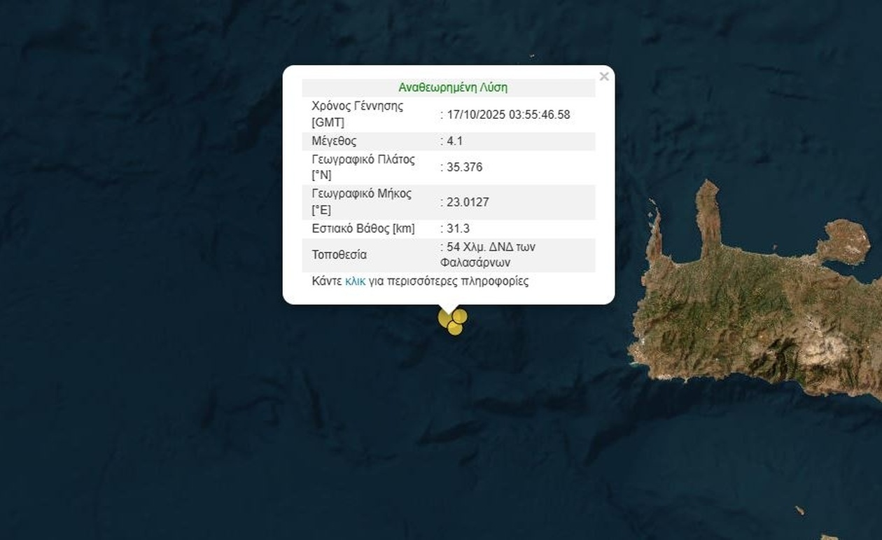 Σύμφωνα με την αναθεωρημένη λύση Γεωδυναμικού Ινστιτούτου του Αστεροσκοπείου Αθηνών, το επίκεντρο εντοπίζεται σε υποθαλάσσια περιοχή, δυτικά της Κρήτης.