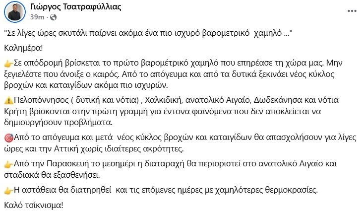 «Σε λίγες ώρες σκυτάλη παίρνει ακόμα ένα πιο ισχυρό βαρομετρικό χαμηλό. Σε αποδρομή βρίσκεται το πρώτο βαρομετρικό χαμηλό που επηρέασε τη χώρα μας. Μην ξεγιελέστε που άνοιξε ο καιρός. Από το απόγευμα και από τα δυτικά, ξεκινά νέος κύκλος βροχών και καταιγίδων ακόμα πιο ισχυρών.