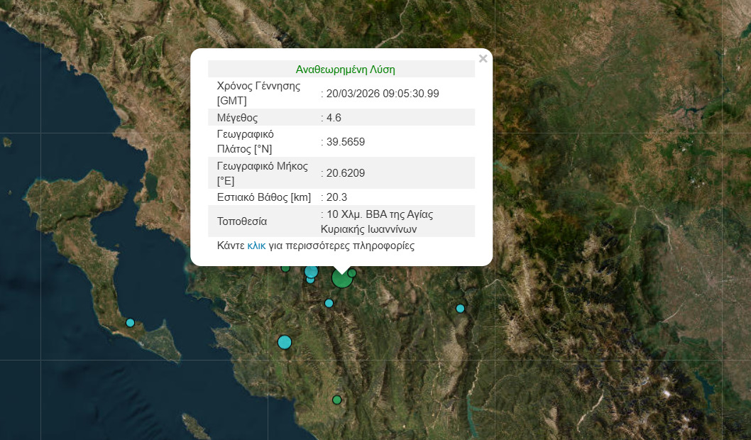 Στις 11:40 σημειώθηκε σεισμική δόνηση μεγέθους 4,5 Ρίχτερ 12 χιλιόμετρα βόρεια-βορειοανατολικά της Αγίας Κυριακής Ιωαννίνων με εστιακό βάθος τα 19,2 χιλιόμετρα.