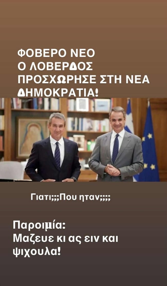 Την προσχώρηση του Ανδρέα Λοβέρδου στο κόμμα της Νέας Δημοκρατίας, σχολίασε με καυστικό χιούμορ ο Λάκης Λαζόπουλος. “Φοβερό νέο! Ο Λοβέρδος προσχώρησε στη Νέα Δημοκρατία. Γιατί πού ήταν; Παροιμία: Μάζευε και ας είναι και ψίχουλα”.