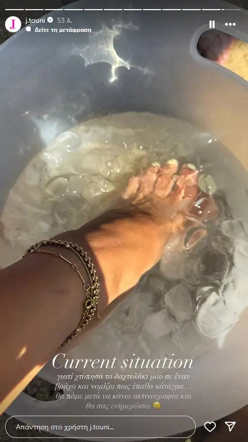 Αρκετές ώρες αργότερα η Ιωάννα Τούνη μοιράστηκε το ατύχημα που είχε στην παραλία. Δημοσιεύοντας φωτογραφία με το πόδι της στον πάγο, η ίδια ανέφερε πως χτύπησε το μικρό δάχτυλο του ποδιού της, ενώ αργότερα θα βρεθεί στο νοσοκομείο για ακτινογραφία.