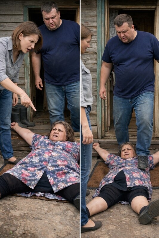 Κατευθυνθήκαμε προς την έξοδο. Είχα ήδη περάσει το κατώφλι, όταν η πεθερά ξάπλωσε ξαφνικά πάνω στο χαλάκι της εισόδου, απλώνοντας χέρια και πόδια για να εμποδίσει τον γιο της με το σώμα της.