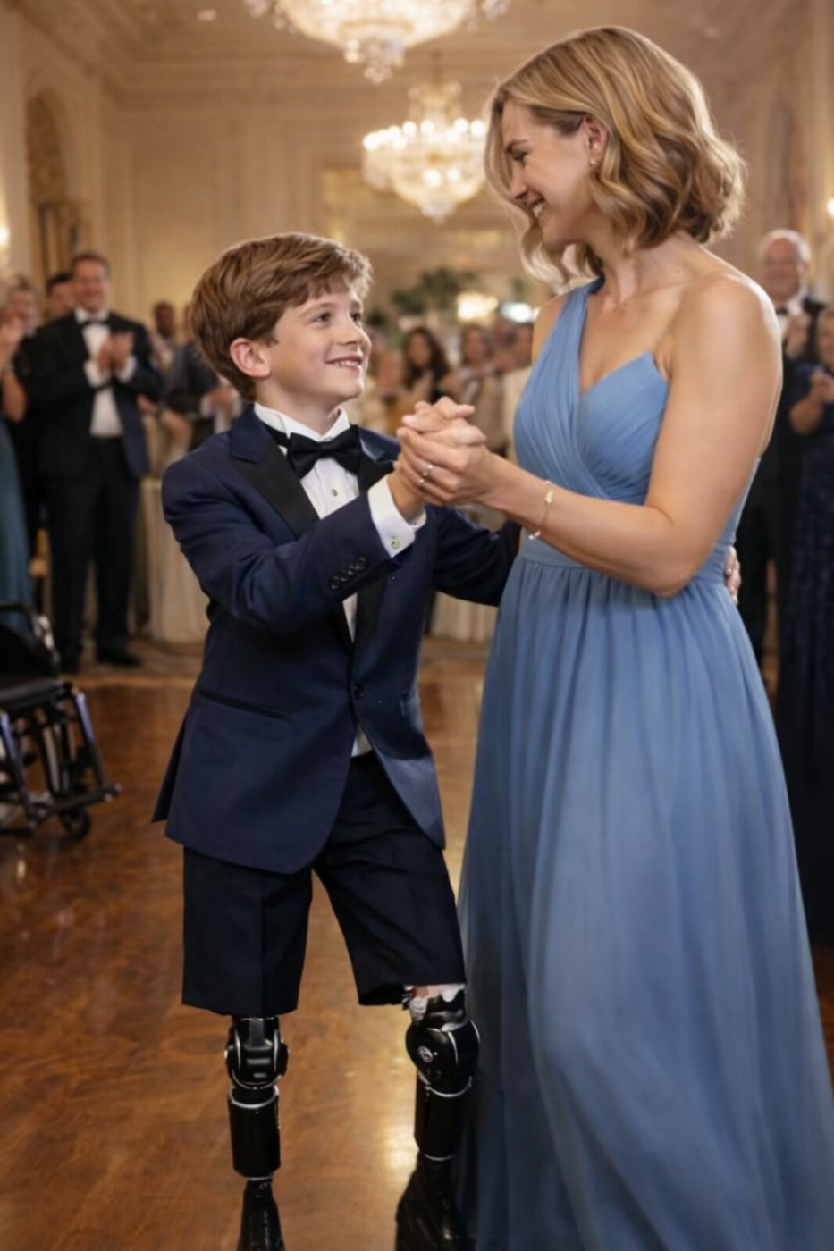 Οι προσθετικές άκρες του παιδιού λαμπύρισαν στο φως της αίθουσας και τα μάτια του γέμισαν, για πρώτη φορά εκείνο το βράδυ, χαρά.