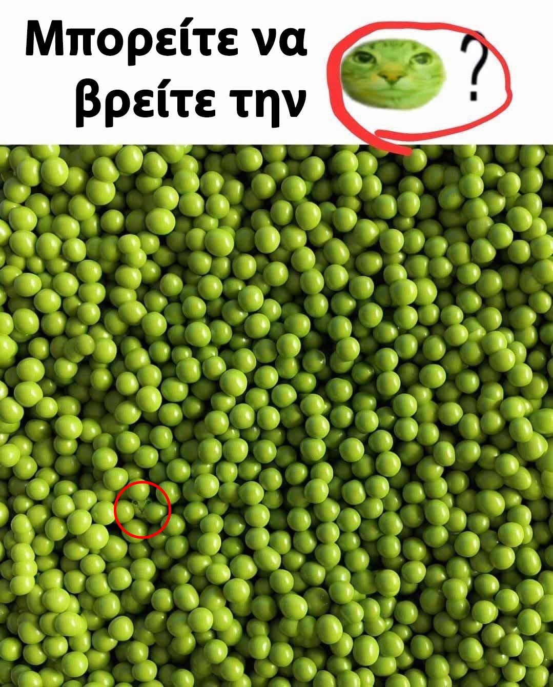 Στο επάνω μέρος της εικόνας, υπάρχει μια ερώτηση: «Μπορείτε να βρείτε την;» και μια μικρή εικόνα ενός προσώπου γάτας ζωγραφισμένου πάνω σε ένα μπιζέλι, τονίζοντας την πρόκληση. Αυτό το είδος εικόνων είναι πολύ δημοφιλές στα social media, γιατί τραβάει την προσοχή και δημιουργεί μια αίσθηση παιχνιδιού και συμμετοχής.