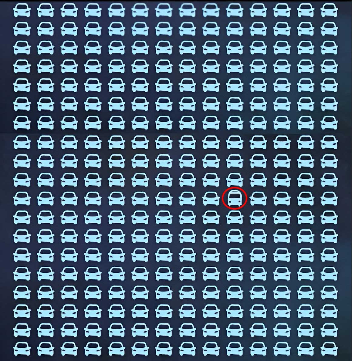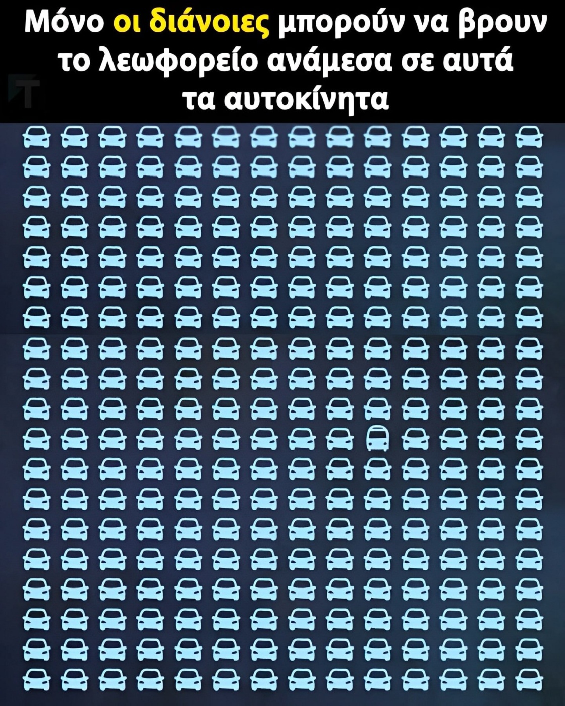 Μια απλή αλλά έξυπνη οπτική πρόκληση έχει γίνει viral: Ανάμεσα σε δεκάδες πανομοιότυπα αυτοκίνητα, υπάρχει ένα και μόνο λεωφορείο. Σύμφωνα με το κείμενο της εικόνας, μόνο οι διάνοιες μπορούν να το εντοπίσουν.