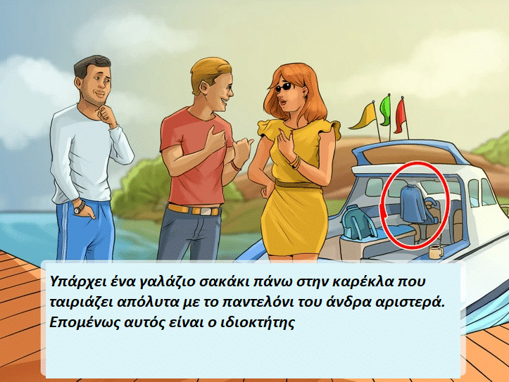 Η παραπάνω εικόνα δείχνει δύο άνδρες και μια γυναίκα να συζητούν μπροστά από ένα γιοτ. Και οι δύο άνδρες υποστηρίζουν ότι τους ανήκει το γιοτ. Ο ένας λέει ψέματα και ο άλλος την αλήθεια. Ποιος είναι ο πραγματικός ιδιοκτήτης του γιοτ;