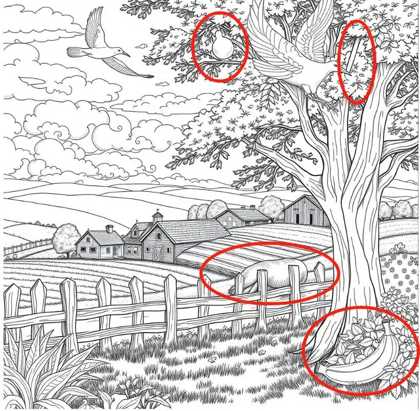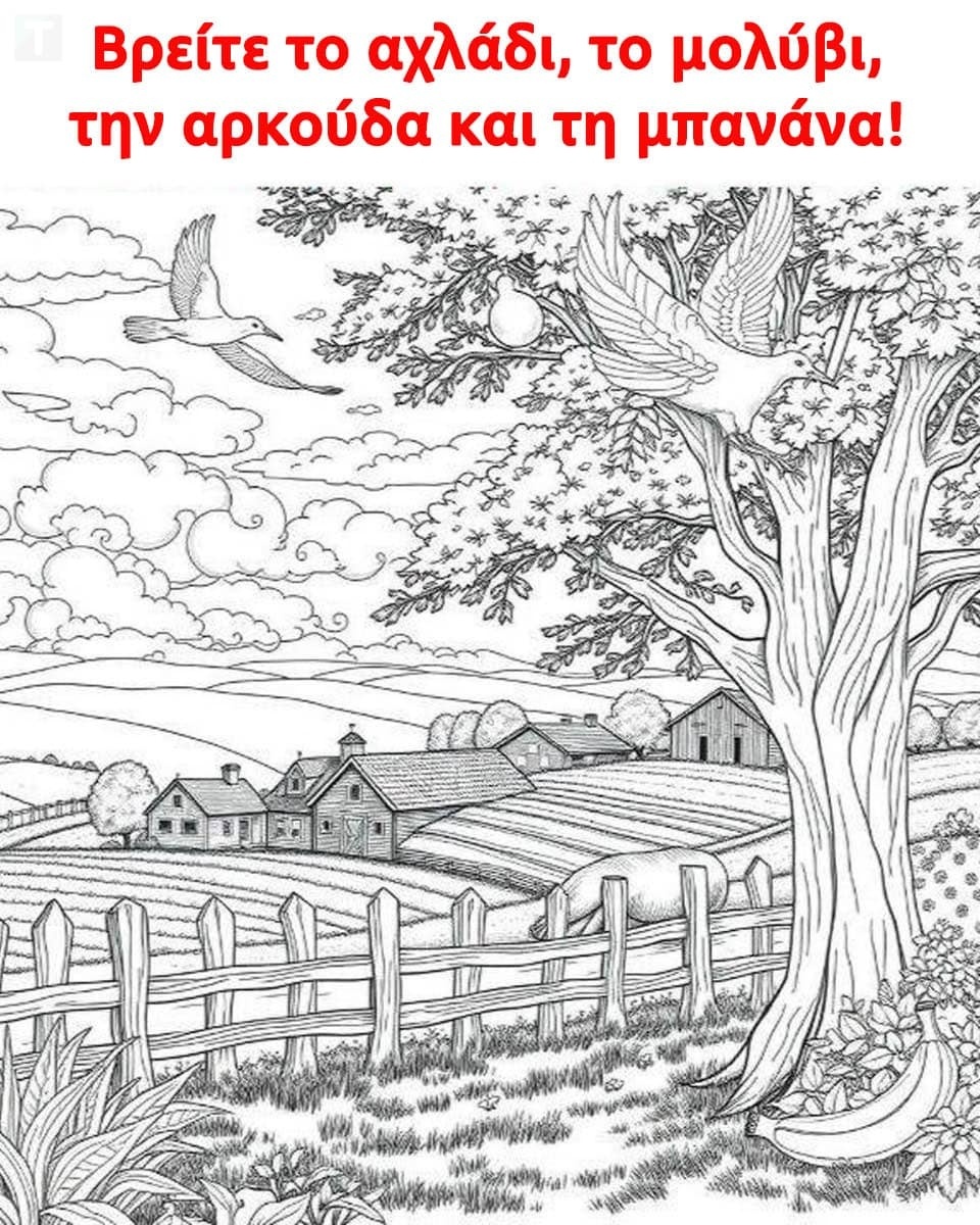 Όμως πίσω από αυτή την ήσυχη εικόνα κρύβεται μια πρόκληση — μπορείς να εντοπίσεις ένα αχλάδι, ένα μολύβι, μια αρκούδα και μια μπανάνα που έχουν «κρυφτεί» έξυπνα μέσα στο τοπίο;