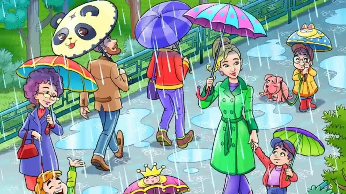 Σε αυτή την εικόνα, μπορείτε να δείτε ανθρώπους μια βροχερή μέρα στο δρόμο με τις ομπρέλες στα χέρια τους. Οι άνδρες, οι γυναίκες και τα παιδιά απολαμβάνουν τη βροχή. Ένα κορίτσι παρακολουθεί το σαλιγκάρι, ένα άλλο κορίτσι κάνει βόλτα τον σκύλο της και το αγόρι βρέχεται στη βροχή.
